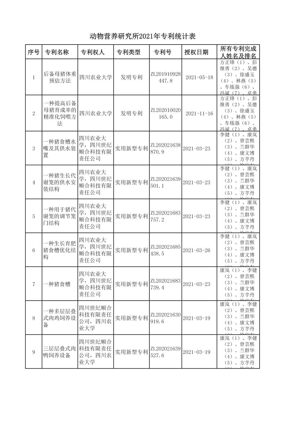 动物营养研究所2021年专利统计表