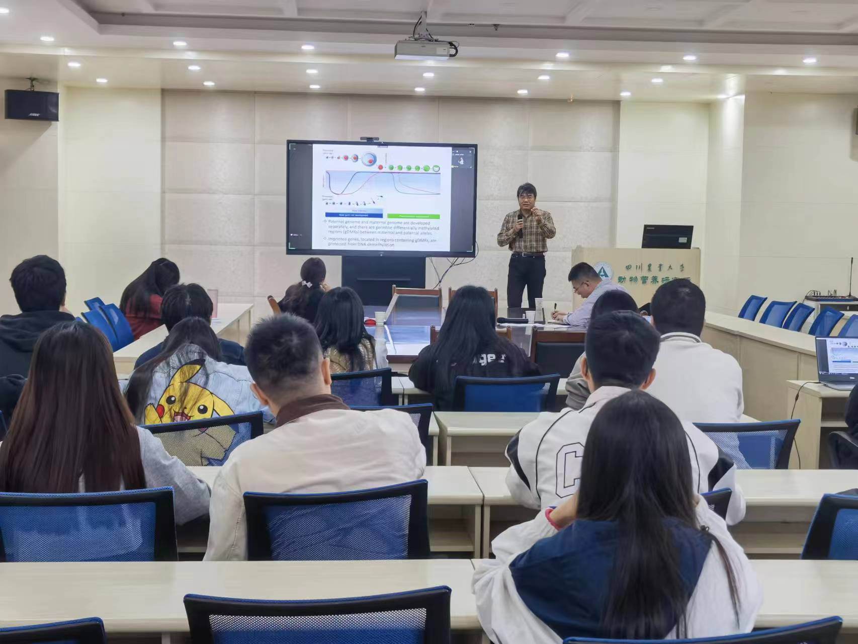 此外,Du教授还做了题为“Early nutrition and developmental programming in livestock production”和“Imprinted genes in mediating intergenerational development due to maternal obesity”的两场学术报告。报告中,Du教授结合自己正在开展的研究工作,讲述了动物肌肉和脂肪的发育规律,分享了其课题组关于母体营养和后代早期营养调控动物肌肉和脂肪发育的部分研究内容。报告从如何发现科学问题,到提出科学假设,再到巧妙的试验设计论证科学假设,深入浅出,讲述生动。动物营养研究所和动物科技学院师生通过线下和线上的方式聆听了学术报告,并与Du教授开展交流。