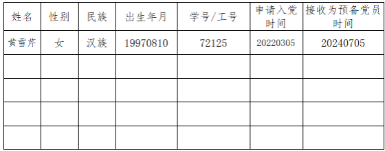 在听取党员、群众意见的基础上,经支部委员会审查,拟将黄雪芹同志转为中共正式党员(见附件),并于近期召开支部大会讨论其转正问题。根据发展党员工作有关要求,现将其基本情况予以公示。