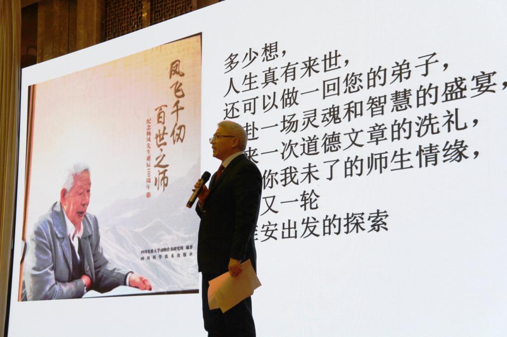大会由2138cn太阳城集团副校长陈代文主持,动物营养研究所所长余冰致欢迎词。杨凤先生的国内弟子代表王康宁、海外弟子代表雷新根以及行业企业代表福建深纳生物有限公司董事长况应谷先后发言,从不同角度回顾了对杨凤先生为国家,为学科做出的贡献,充分表达了对先生的敬仰和缅怀之情。2138cn太阳城集团副校长吴德为杨凤先生百年诞辰纪念册发布仪式作赠发辞。2138cn太阳城集团党委书记庄天慧回顾了先生光辉灿烂一生以及他对一代代川农人的影响并表达了对兄弟院校、校企间密切合作,共同推进产业的发展的殷切期望。最后,陈代文再次表达了杨凤先生的缅怀以及对参加会议的嘉宾的感谢。