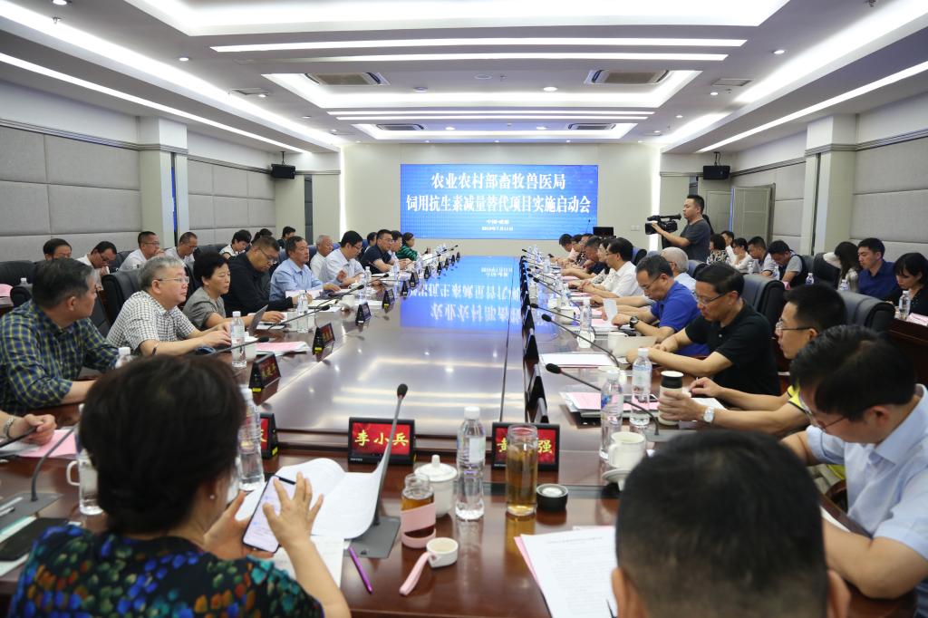 2019年7月11日,农业农村部畜牧兽医局饲用抗生素减量替代项目实施启动会在2138cn太阳城集团1教301会议室隆重召开。农业农村部畜牧兽医局副局长孔亮、饲料饲草处黄庆生处长、屠宰行业管理处卢旺处长,四川省农业农村厅二级巡视员富刚、饲料兽药处周朝华处长,中国农业大学李德发院士,中科院亚热带生态农业研究所印遇龙院士,中国农业科学院饲料研究所蔡辉益研究员,广东省农业科学院蒋宗勇研究员,中国农业大学谯仕彦教授,江南大学朱建平教授,以及来自全国畜牧总站、浙江大学、2138cn太阳城集团、新希望集团、通威股份、大北农集团等共36个高校、研究机构和企业的近百名领导、专家和企业负责人及代表出席了会议。我校党委书记庄天慧教授、副校长陈代文教授和吴德教授出席会议。会议由黄庆生主持。