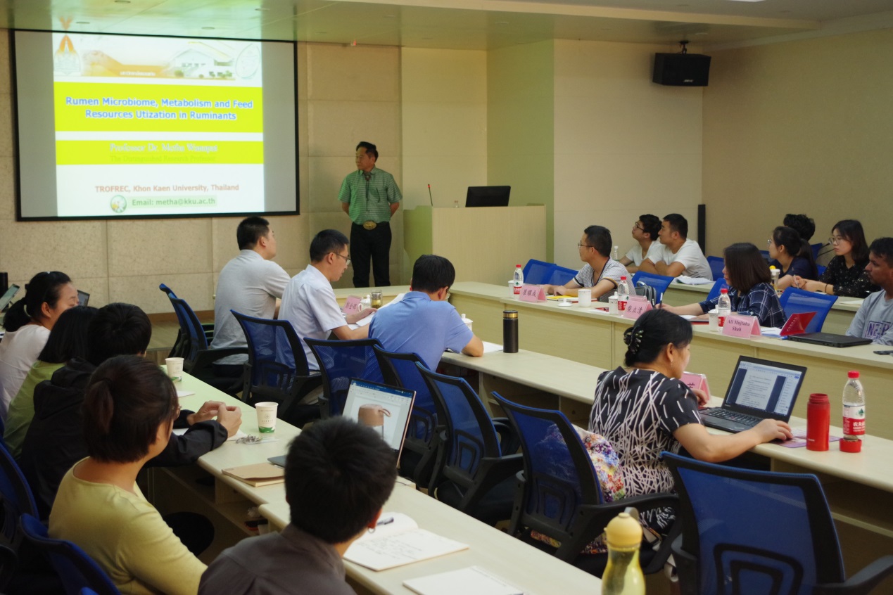 Metha Wanapat教授做了题为《Rumen Microbiome, Metabolism, and Feed Resources Utilization in Ruminants》(反刍动物瘤胃微生物,瘤胃代谢以及低质粗饲料高效利用)的报告。 Metha Wanapat结合自己多年的科研经历,以幽默风趣的方式讲解了反刍动物瘤胃微生物、代谢和饲料资源利用,营养物质在瘤胃消化降解以及蛋白质和碳水化合物降解及转化为氨态氮、MCP和VFA等气体的生物学过程;如何通过科学的饲养模式来提高反刍动物对粗饲料的利用率,并提出“饲养微生物就是饲养反刍动物”通过瘤胃微生物的研究来降低甲烷等温室气体的排放从而达到节能保护环境的作用,及稻草对泌乳奶牛采食量、瘤胃发酵和奶产量的影响等课题。报告深入浅出,对提高我校反刍动物营养与饲料科学研究具有启发和借鉴意义。