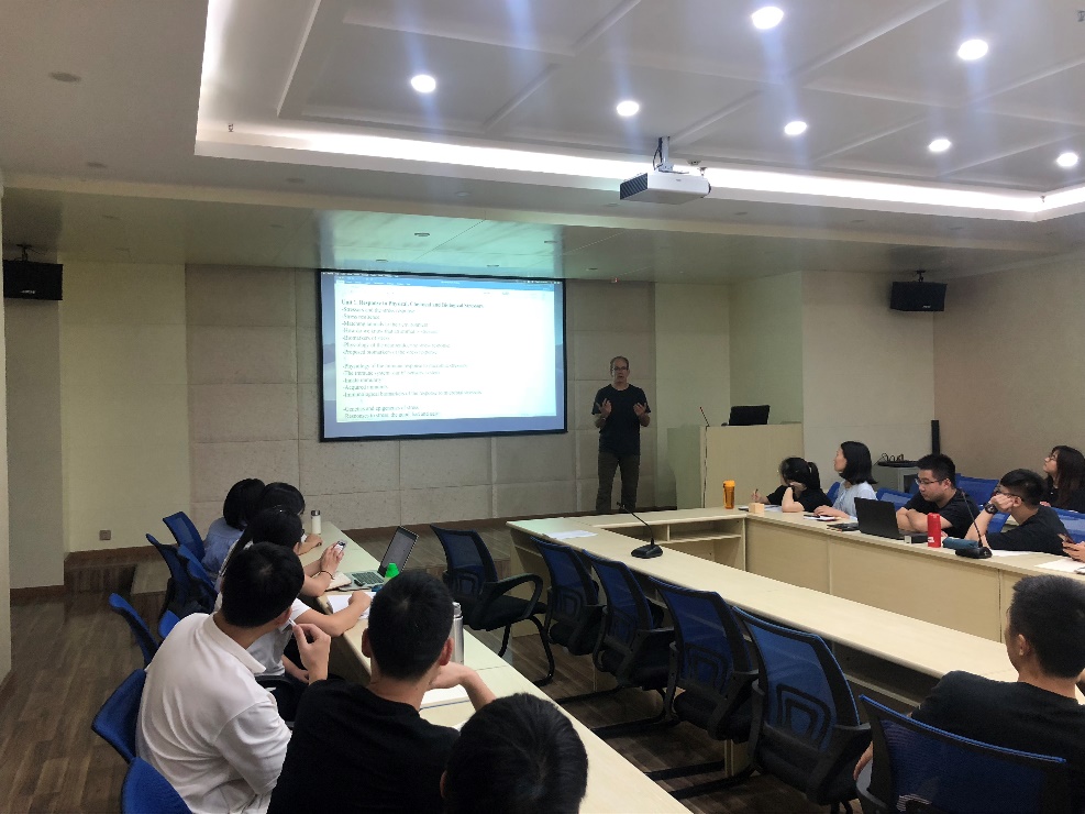 2019年9月8日-9月21日,“动物营养与饲养科学学科创新引智基地”(“111基地”)特聘外籍专家,加拿大圭尔夫大学(University of Guelph)Niel Karrow教授到我校履职。这也是Karrow教授作为“111基地”特聘外籍专家第二次到我校履职。期间,Karrow教授为我校动物科学类的学生讲授了《Animal Health》课程。他从影响动物健康的因素、应激、免疫、微生物感染、呼吸系统健康、肠道健康等方面深入讲解,并提出一些常用的提高动物健康的方法。营养所和动科院师生30余人参加了该课程。