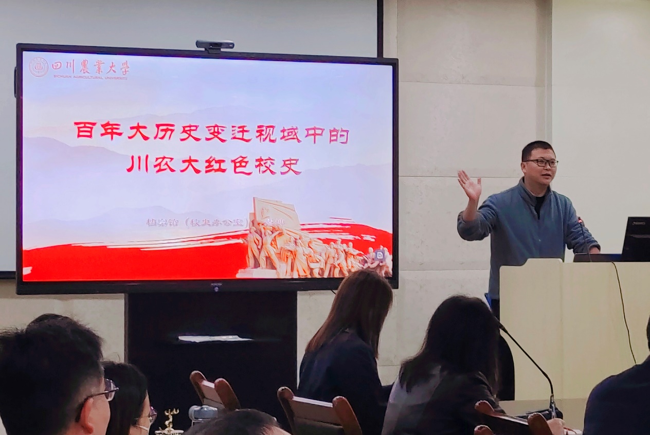 随后,他介绍了马克思主义的早期传播者王右木,传薪奋斗的学生康明惠,英勇就义的“川南农王”郑佑之,全面抗战时期对粮食输出贡献巨大的杨开渠、杨允奎等川农前辈,还介绍了共和国诞生前后的川农英烈校友,江竹筠、胡其恩、黄宁康、何懋金、张大成、李树成等,这些英烈为川农历史增加了浓墨重彩的一笔,在川农历史的每个角落都留下了不可磨灭的红色印记。