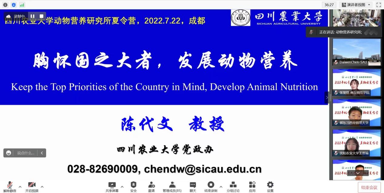 7月22日上午我校副校长、动物营养学科带头人陈代文教授为来自26所高校,参加动物营养研究所第一届优秀大学生暑期云夏令营活动的110余名师生作学术报告。本次活动采取线上线下结合的方式,学术报告由车炼强教授主持。