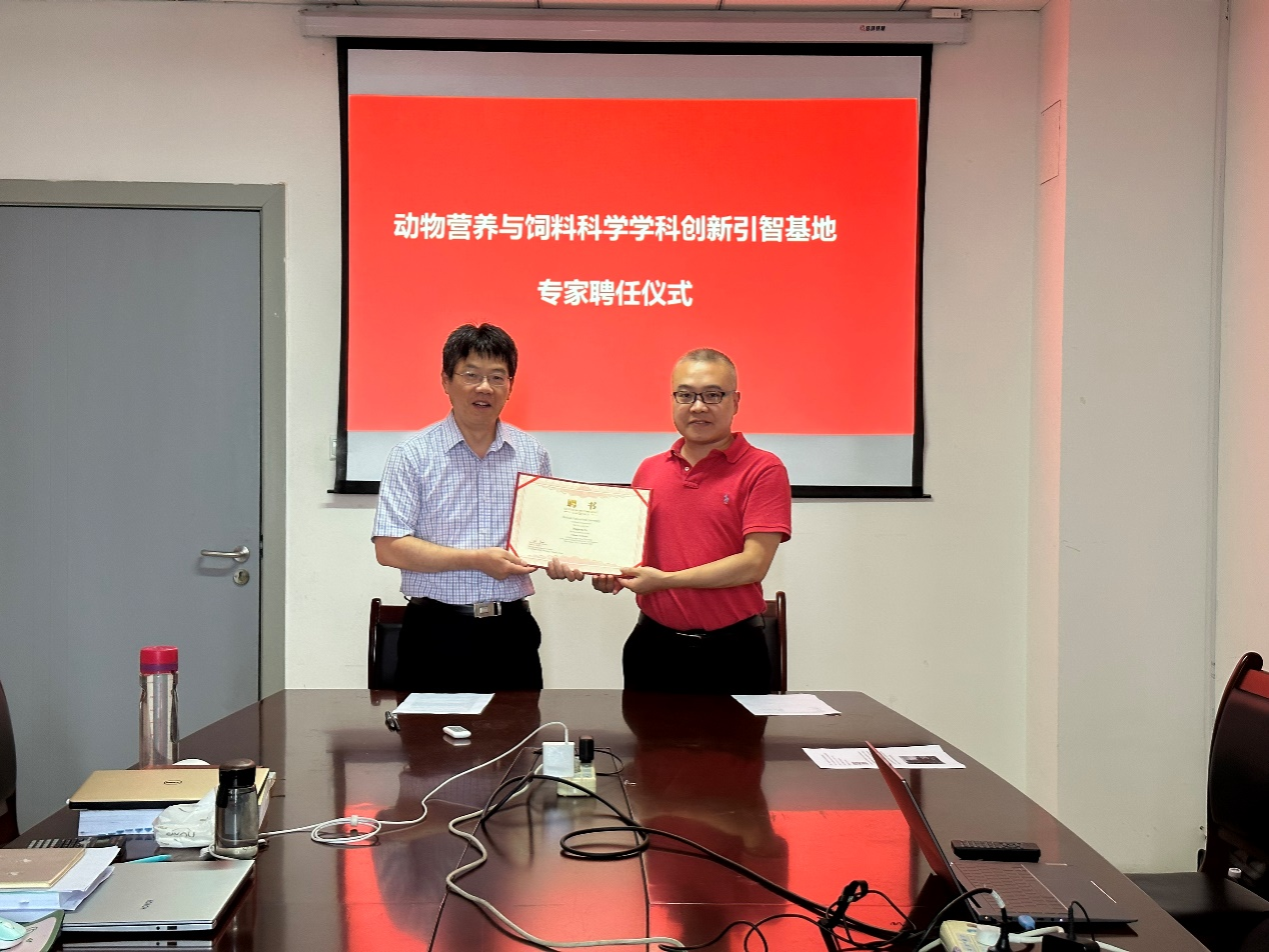 2023年7月12日下午,动物营养研究所领导在成都校区6教611为Peiqiang Yu教授举行了聘任仪式,正式聘任Peiqiang Yu为饲料科学学科创新引智基地(“111”基地)特聘教授。仪式由冯斌教授主持,所长何军教授、“111”基地办公室主任罗玉衡教授,以及部分博士研究生参加了此次聘任仪式。何军所长高度肯定了Peiqiang Yu为学科建设作出的巨大贡献,并对未来加强双方合作和人员交流提出了殷切期望。