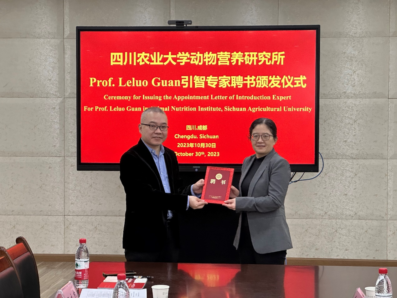为加强我校“动物营养与饲养科学学科创新引智基地”(以下简称“111基地”)建设,丰富“111基地”外籍专家的专业涵盖范围,动物营养研究所近日邀请了来自不列颠哥伦比亚大学的Leluo Guan教授加入专家团队。2023年10月30日上午,动物营养研究所在成都校区6教9楼会议室为Leluo Guan教授举行了聘任仪式,所长何军教授为其颁发聘书,正式聘任Leluo Guan为“111基地”特聘教授。仪式由王立志教授主持,反刍动物营养研究室学术带头人王之盛教授、动物医学院副院长左之才教授、“111基地”办公室主任罗玉衡教授、薛白教授,以及姜雅慧、胡瑞、郭红瑞、肖鉴新等老师和部分研究生参加了此次聘任仪式。何军所长首先介绍了动物营养研究所的历史沿革及科研教学情况,高度肯定了Leluo Guan教授此次川农之行的巨大意义,并对未来加强双方合作和人员交流提出了殷切期望。聘任仪式结束后,Leluo Guan教授参加了反刍动物营养团队举行的年度研究生学术Seminar,对每个报告予以了精彩点评和指导。