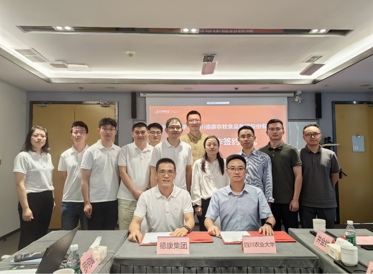 2025年9月10日,为深化产学研合作,促进校企深度融合,充分发挥双方优势资源,实现互补共赢。动物营养研究所所长车炼强教授带领猪营养与饲料研究室科研骨干林燕教授、卓勇副教授、特聘研究员井金钟博士、青年研究员姚任杰博士及科研助理等,前往四川德康农牧食品集团股份有限公司(简称德康集团)签署产学研合作协议,德康集团首席科学家舒鼎铭博士、营养总监罗何峰博士、营养与饲料部门负责人和技术骨干参与了交流。
