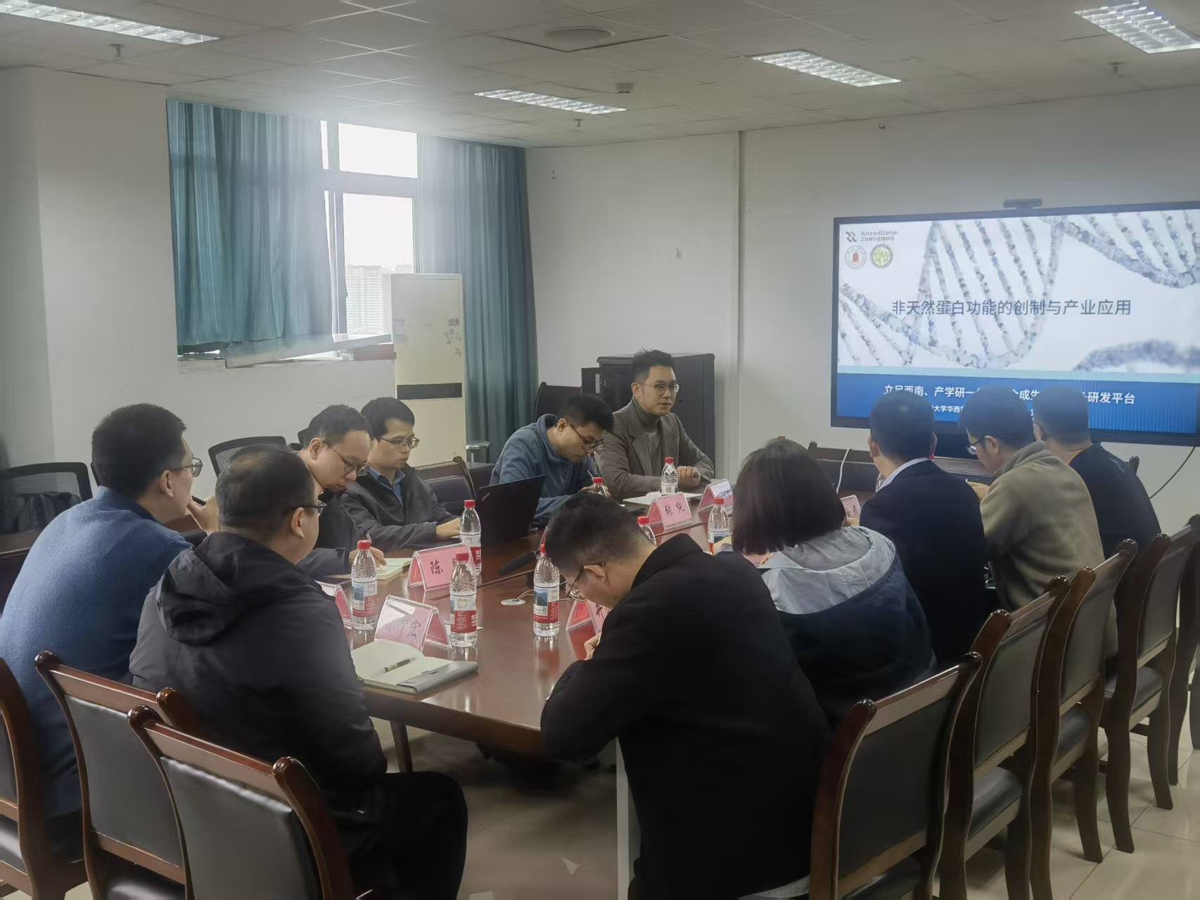 随后,双方就各自团队的研究方向、技术优势及发展需求展开深入探讨。川农团队分享了动物营养研究的方向和难点,提出了新型饲料原料和添加剂开发的需求和注意事项。贾知军团队分享了团队目前的一些酶库,并期待双方就合成生物蛋白在畜牧上的应用深化合作,推动生物合成技术与畜牧业交叉融合和成果转化。交流会持续2个多小时,双方均表示交流卓有成效,收获很多新知识,并就尽快开展合作提出建议。