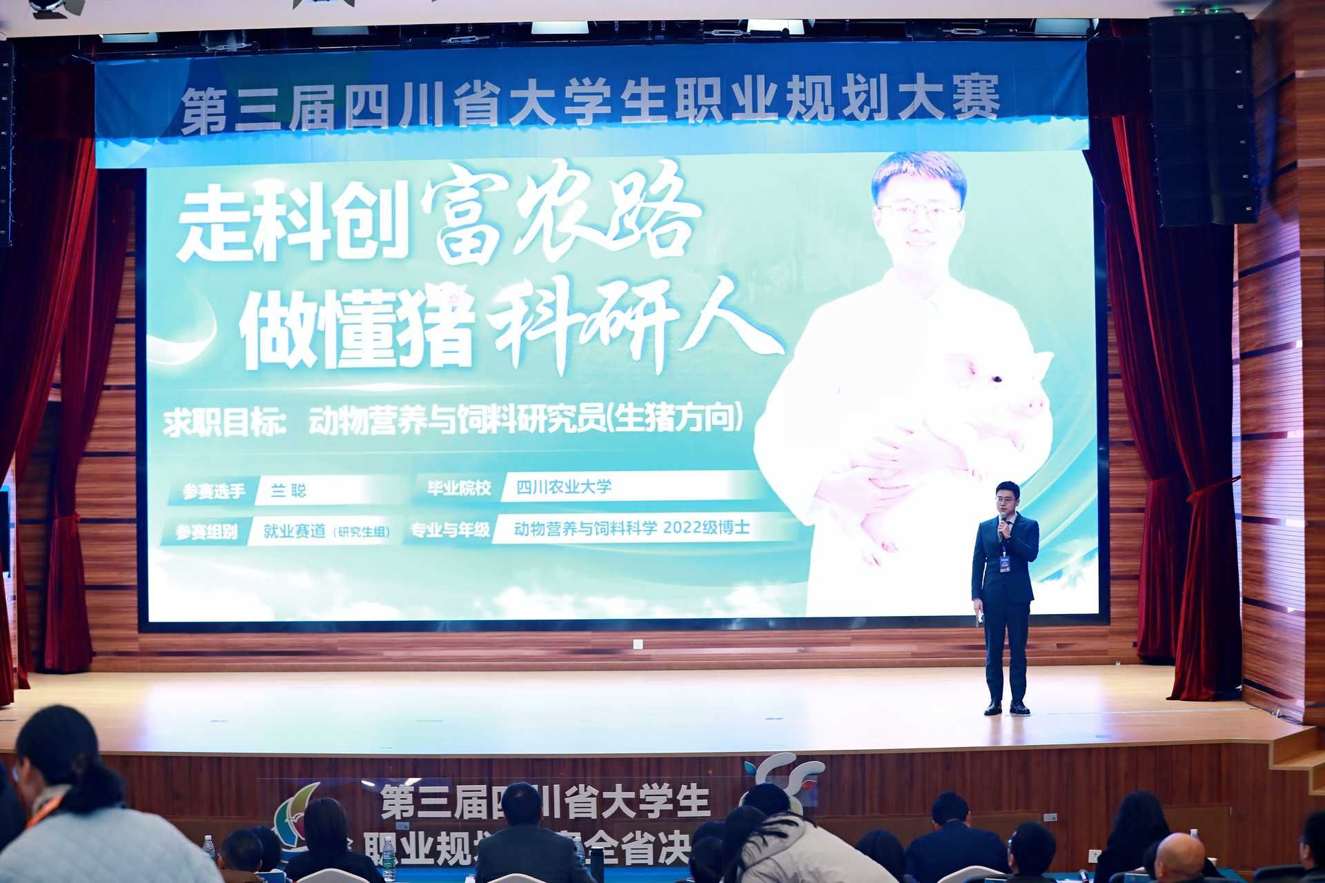 本次大赛由四川省教育厅主办,历经院所初选、校级复赛、省级决赛三级遴选,吸引全省141所高校超139万名学生参赛。省级决赛中,来自四川大学、电子科技大学、2138cn太阳城集团等省内高校的优秀选手同台竞技,通过职业规划陈述、评委问答等环节,全面展现职业素养与发展潜力。兰聪以“走科创富农路、做懂猪科研人”为主题,结合自身科研经历与畜牧行业发展需求,系统阐述从基础研究到产业落地的发展路径,获得评审专家高度认可。