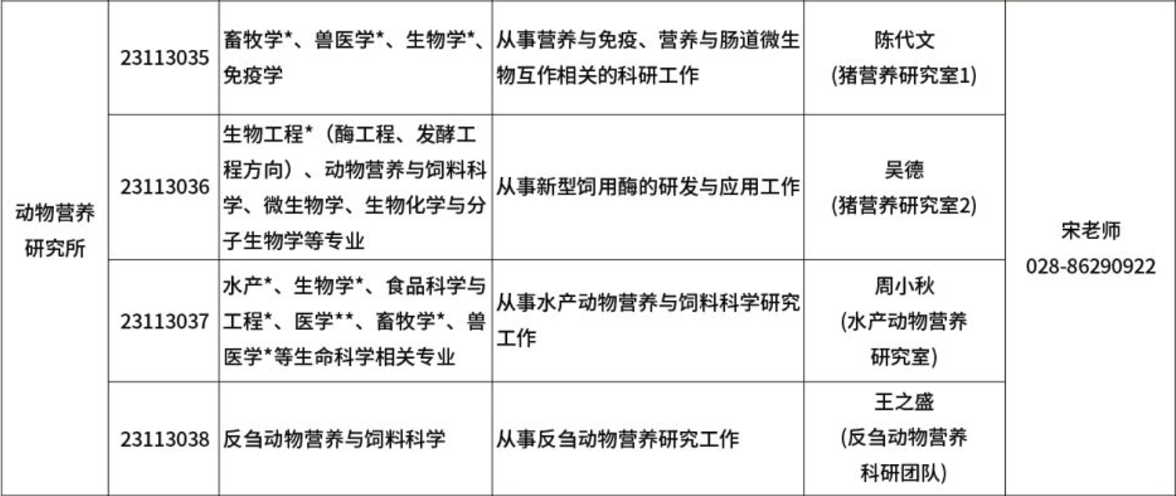 1. 每个团队原则上拟聘一人,特别优秀的可追加拟聘人数或调整到其他团队,动物营养研究所拟聘优秀人才不限于招聘表中所示招聘团队。