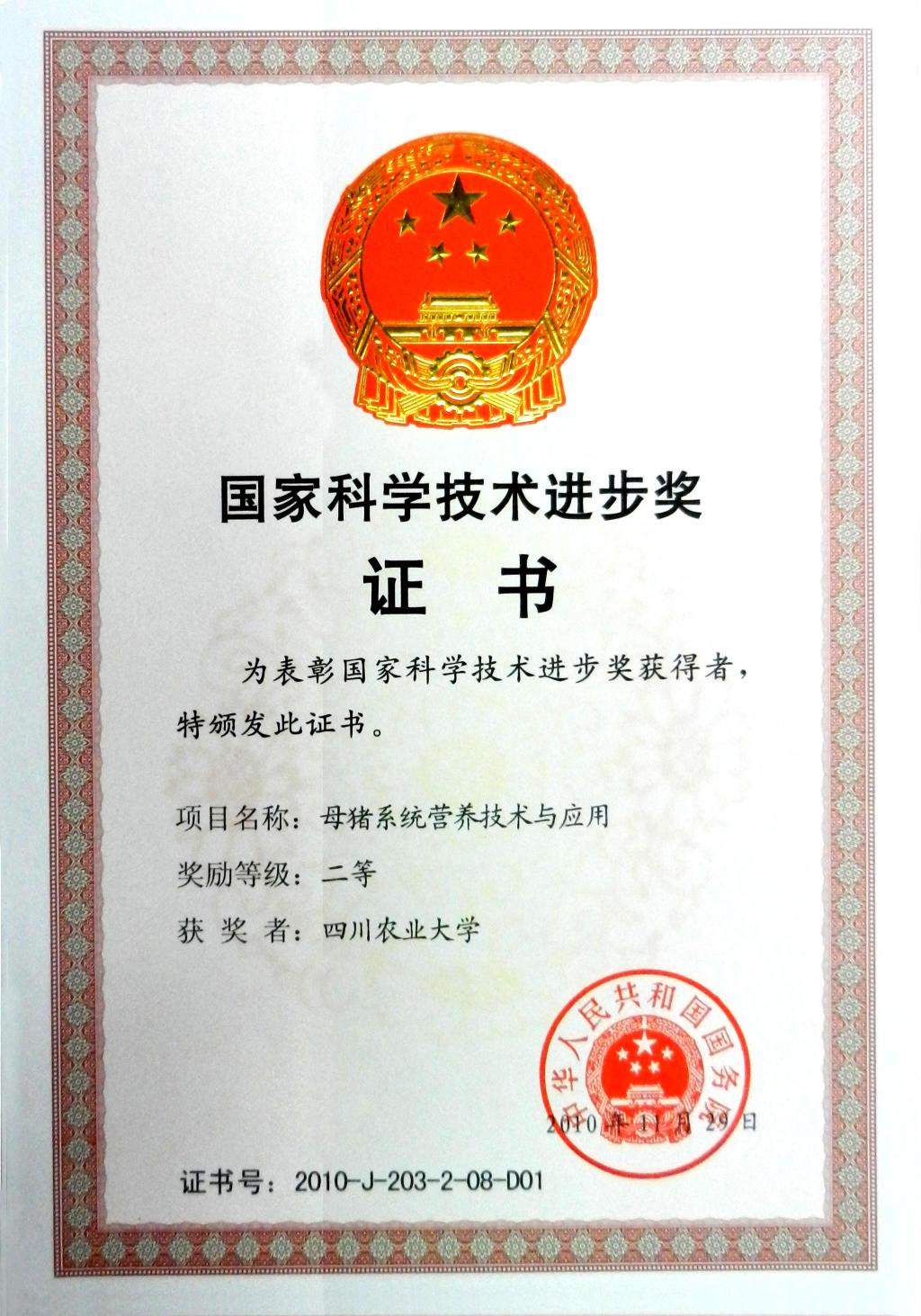项目针对现代母猪生产和理论研究中存在的突出问题,结合母猪繁殖生理规律,对母猪营养与饲养技术开展了系统深入的研究,在母猪营养理论和饲养技术方面取得了重大突破。首次揭示了后备母猪初情启动与营养的互作规律及其分子机制,阐明了营养影响卵母细胞质量和胚胎存活的机理,建立了实现母猪终身繁殖成绩最优的系统营养理论和参数,突破了国内外几十年来以单胎繁殖为基础的营养理论和模式。其学术研究成果以论文或专著形式发表,并已纳入教材,更新了传统理论。参与制订中国《猪饲养标准》1套,四川省地方标准3套,申请国家发明专利4项,授权实用新型专利2项,构建母猪饲养配套技术5套。研制功能性添加剂产品4个,专用10%预混剂产品7个,并已实现产业化。经国内权威同行专家鉴定认为,“该项成果整体达到国际先进水平,部分研究达到国际领先水平”。