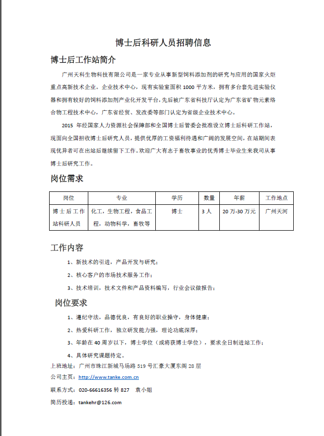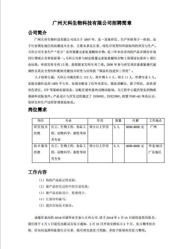 广州天科生物科技有限公司招聘简章