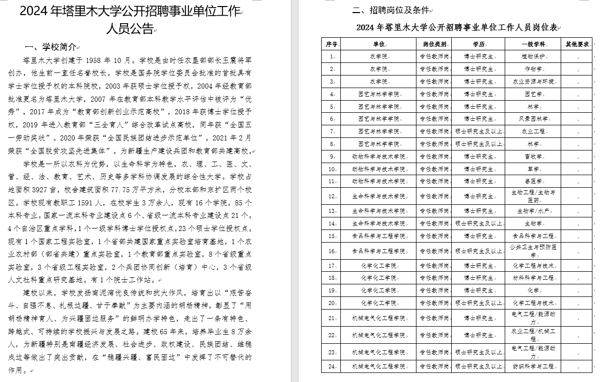 2.《2024年塔里木大学公开招聘事业单位工作人员公告》网址:https://www.taru.edu.cn/info/1046/27673.htm
