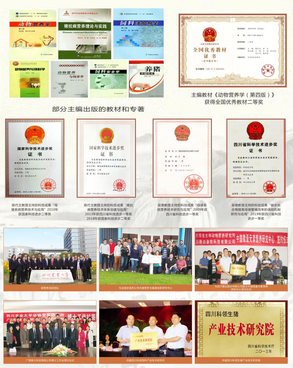 人才培养:研究室不断探索适应现代畜牧业发展需求的协同创新培养模式,全面实行研究生分类培养;采取个人和团队联合指导以及校内外联合指导等举措,建立了提高导师及学生培养质量的途径和方法。近五年,研究室累计招收硕士研究生292名,博士研究生62名;毕业硕士163名,博士37名。主持获国家教学成果二等奖1项,全国高校教师教学创新大赛三等奖1项;四川省教学成果奖特等奖1项、一等奖3项、二等奖1项。主编的教材《动物营养学(第四版)》获评首届全国优秀教材奖,为全国畜牧学科唯一获奖教材。