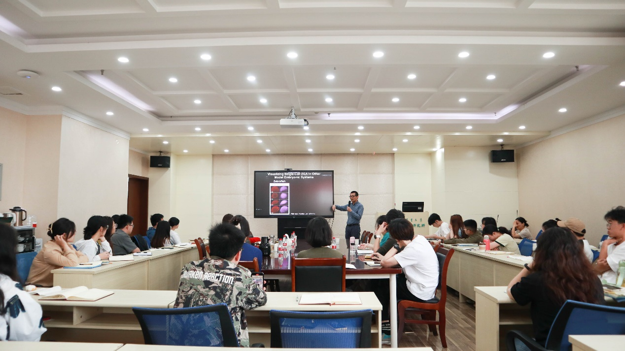 2023年6月3日周六上午10:00,成都校区6教9楼会议室,美国宾夕法尼亚大学医学院高级研究员陈辉博士作了题为“Time, Space and Size: Genome Activation in Early Embryo Development(时间、空间和大小:早期胚胎发育的基因组激活)”的学术报告。会议由动物营养研究所副书记、副所长冯琳教授主持,报告形式为线上线下结合,全校师生80余人参会。