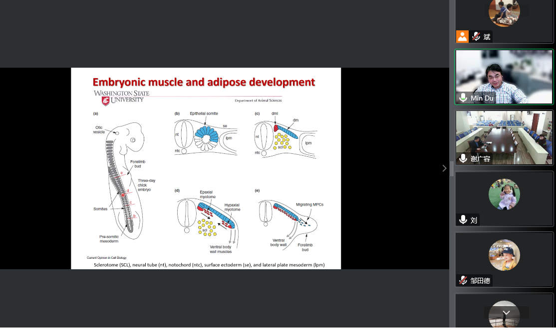 报告结束后,参会师生与Du教授进行了充分而热烈的交流和讨论。通过此次报告会,老师和同学们对母体营养传递、肌肉脂肪发育有了更深的了解,对国内畜禽动物营养研究和养殖工作具有一定的指导和参考。